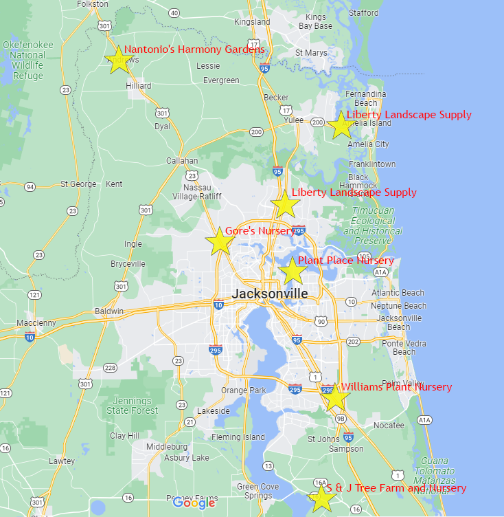 Three recommended nurseries are off the map. The well stocked Green Isle Gardens and The Natives are near Orlando. For dune plants, keep going south to Green Seasons Nursery near St Petersburg.